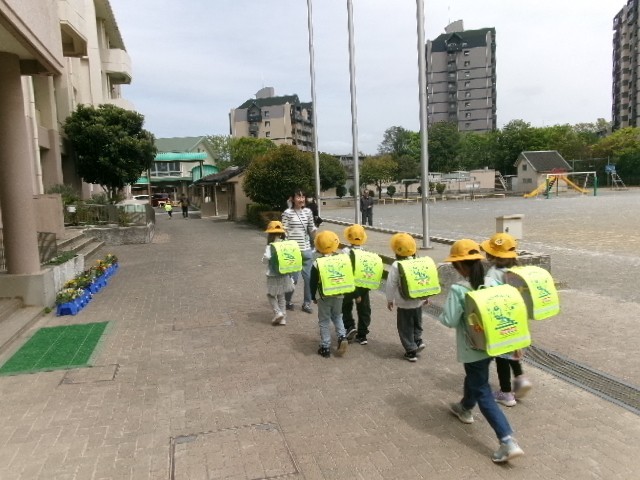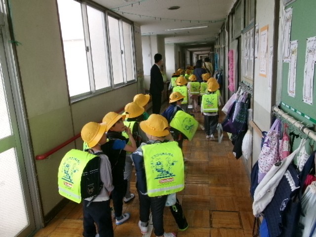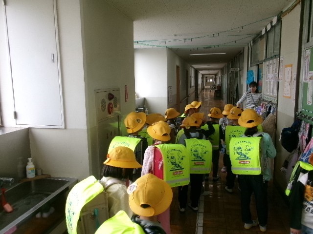 今日まで1年生は給食を食べずに午前中で下校です。方面ごとに列を作って歩いて帰っていきました。