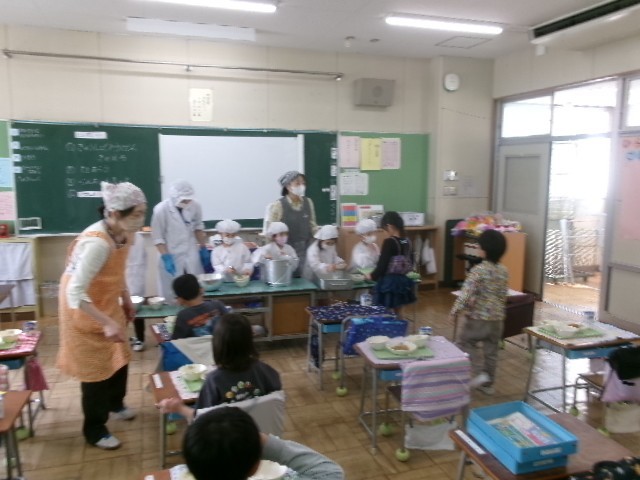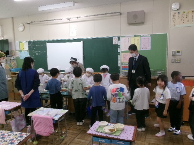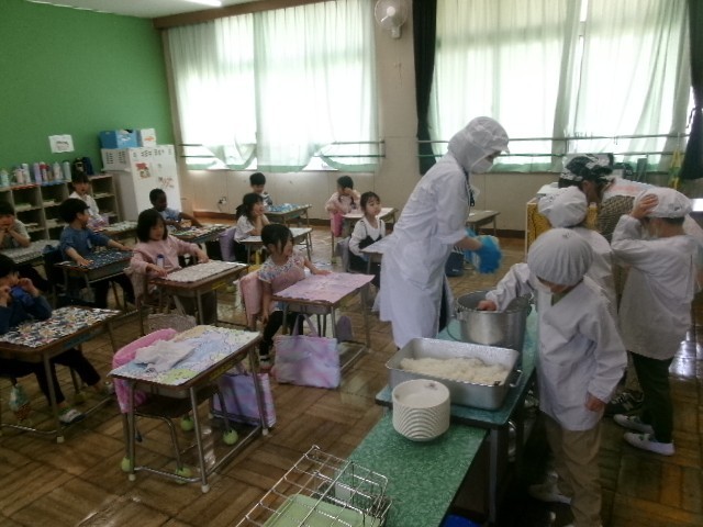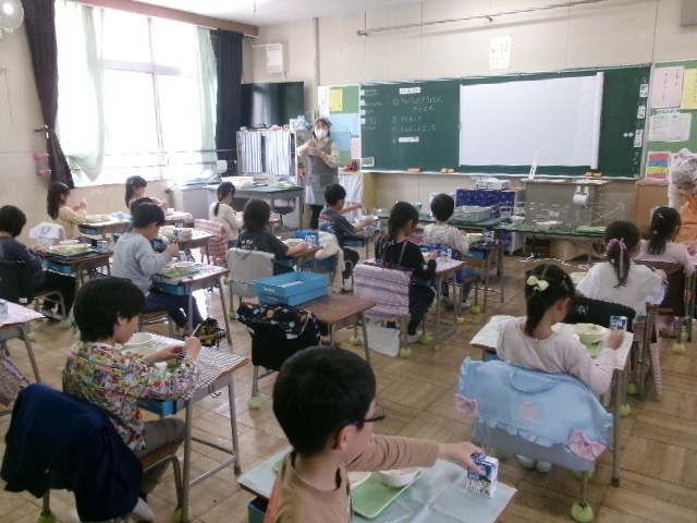 1年生は待ちに待った初めての給食です。給食の配膳の仕方や片付け方を事前に学習し、先生たちの力も借りてとてもスムーズに準備することができました。