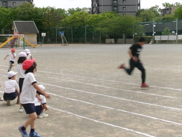 画像は測定後に張替先生と児童が競争していたものです。張替先生がとても速くて、みんなびっくりしていました。