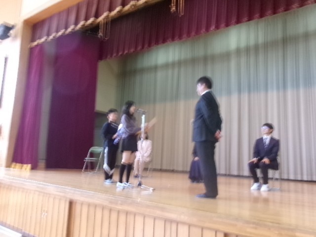 代表児童の人たちは、先生方への感謝の思いをしっかりと伝えることができました。また、離任された先生方のお話を楽しむときは楽しむ、静かに聞くときは聞く、とけじめをつけて聞くことができました。