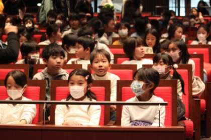 12月6日(木)。5年生が連合音楽会に参加しました。体育館で早朝練習をして、8時15分に学校をバスで出発。オリンパスホールに今日午前中参加の12校中一番乗り。開場が9時のため入口で10分程待ちましたが、愛宕の子たちの態度は素晴らしく整然と並び他校の模範になっていました。開場して座席に着き開会を待ちました。待っているときの様子です。