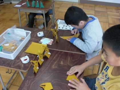 今日は、各組に別れ「景品」作りをしました。1組は、折り紙で「トナカイ」、色画用紙で「ミニツリー」を作っています。「トナカイ」は、立たせて飾ることができます。とっても可愛いです。3名とも、ていねいに折ったり、線を良く見て切ったりと、集中して取り組んでいました。