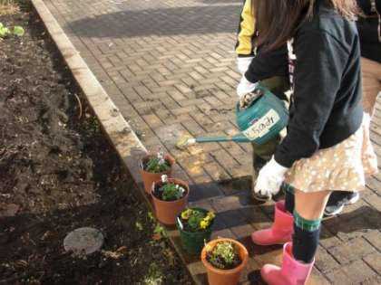 ビオラを植えました 2 公開日 2012/12/18 更新日 2012/12/18 とちのみ学級 しっかり土が入ったか、鉢を地面にトントンと落として確かめました。その後、班ごとに並べ、水をたっぷりかけました。 白・黄色・紫・オレンジと紫・黄色と紫など、いろいろな色のビオラがありました。どうしてその色を選んだのかを聞くと、「ポケモンの好きなキャラクターの色だったから。」「好きな色だったから。」「オレンジと紫の2色で珍しいと思ったから。」など、一人一人理由を言うことができました。