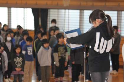 1月8日(火)。2週間の冬休みを終えて、子供たちの元気な声が学校に戻ってきました。朝、体育館で3学期の始業式を行いました。校長の式辞のあと4年生代表の児童2名が2学期の反省を踏まえて3学期の抱負を発表しました。2人とも理由を明確にして自分の意見をハッキリと発表することが出来ました。自分の苦手なことにもチャレンジすることで充実した3学期にしたいという意気込みを感じました。みんなそれぞれ精一杯頑張りましょう!!