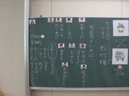 「お正月といえば」という詩を学習します。まず「お正月」と聞いて何を思い浮かべるか一人ずつ聞いてみました。次に、お正月に関係する絵を6枚見せて、名前を知っているかどうか聞いてみました。「しめかざり」「かどまつ」の絵を見せると、「お正月に見たけど・・・。」のつぶやき。