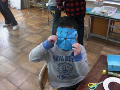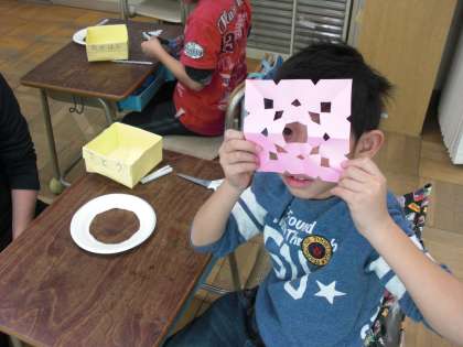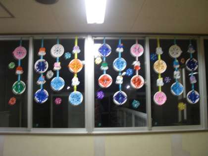 今月の「とちのみギャラリー」の飾りを作りました。今回のメインは、折紙の飾り切りです。三角に3回折り、どこを切るか自分で考え、三角・丸・四角などの模様を書いて切り取りました。模様を書かずに、はさみを上手に動かして切り取る児童もいました。でき上がった模様に喜び、友達や教師に見せ、楽しみながら取り組む様子が見られました。模様は紙皿に貼りました。そして、折り紙で折った「雪だるま」も一緒に布テープに貼り、個人作品に仕上げました。来校した時に、ぜひご覧いただければと思います。