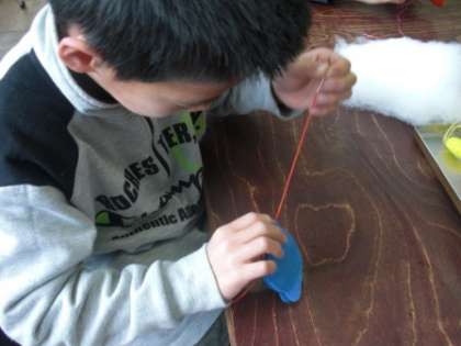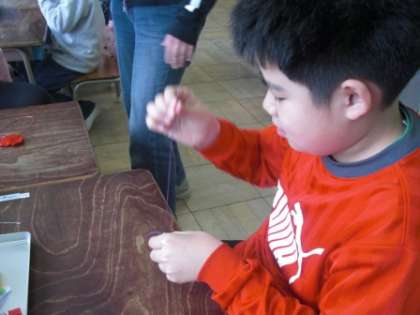開級した年から交流及び共同学習をしてきた「手しごと手あそびの会」。お母さん方が、今年も6つのお店を出してくれました。学級には、今年で「4回目」という子がいます。その子供たちは、経験した回数が多い分、見通しをもち、自信をもって会に参加していました。技術的にも、昨年度より手早く上手に作りあげることができました。また、戸惑っている友達がいると、優しく教えてもくれました。