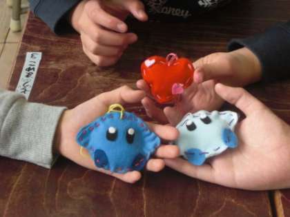 この写真は、「ちくちくやさん」での様子です。フェルトに付けた印を良く見て、指に針が刺さらないように気を付けながら、かわいいマスコットに仕上げることができました。