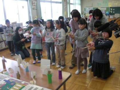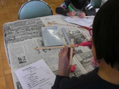 的を目掛けて、実際に撃ってもみました。的には当たるけれど、的が倒れないこともありました。どうやったら、倒れるくらい輪ゴムの力を強くすれば良いかを考え、鉄砲に工夫を加える児童もいました。