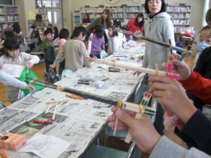 これは「しゃてきやさん」の様子です。お母さん方が作ってくれた割り箸鉄砲の土台に、ゴムをかけるためにとても大事な2本の割り箸を、輪ゴムでぐるぐる巻いて、鉄砲を完成させました。その後、思い思いに鉄砲に色を塗りました。