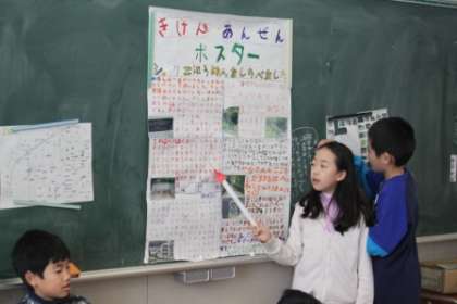 地域安全・危険マップの発表会1 公開日 2013/01/16 更新日 2013/01/16 今日の出来事 1月16日(水)。3.4時間目に3〜4年生が地域安全・危険マップの発表会を行いました。それぞれのグループが実際に歩いて調べたことを分かりやすく新聞形式にしたり、紙芝居形式にしたり、劇を織り交ぜたりとグループ毎に発表を工夫していました。 聴く側は、メモをとりながら真剣に聞いていました。 校長より 3年 4年 行事