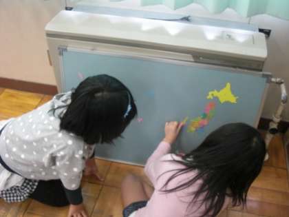 2組Aでは、関東地方の他に「都道府県」の学習も始めました。都道府県の名前を覚えたり、日本の中のだいたいどこの位置にあるかを知って欲しいと思いました。そうすることで、テレビから「○○県」「○○府」などと聞こえてきた時、日本地図でいうあそこの位置の話だとイメージをもつことができ、世間話へも関心が広がるのではないかと思いました。