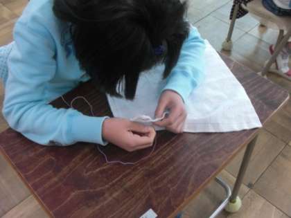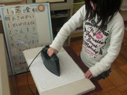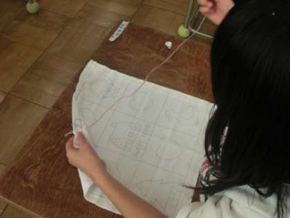 今日から、2組Aは「刺し子」を始めました。まず、しわのあった布にアイロンをあてる所から始めました。その後、模様がプリントしてある所を、ゆっくり、丁寧に縫い始めました。「なかなか楽しいね!」「出来上がるのが楽しみだね!」というつぶやきを聞くことができました。
