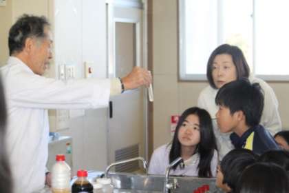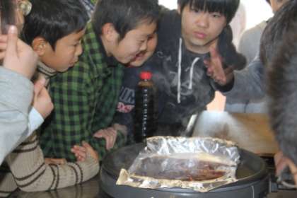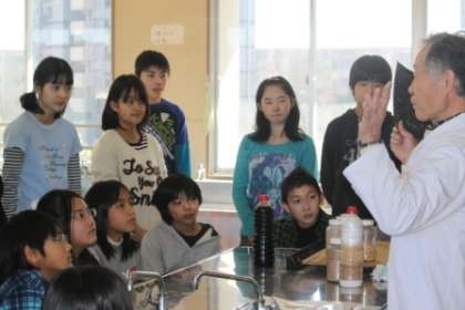 1月28日(月)。3〜4時間目に日本醤油協会の方にお出でいただき6年生が学習しました。3時間目の6年1組の様子をご覧ください。初めに、醤油を温めて香ばしい香りを全員が体験するところから授業が始まりました。「醤油の香りの成分は何種類くらいあるのか?」の質問に300種類と知りビックリ。次に「醤油の原料は?」の質問に「大豆」「塩」は直ぐに出ましたが「小麦」「麹菌」については教えていただきました。3枚目は、試験管に入った「麹菌」を見ている様子です。