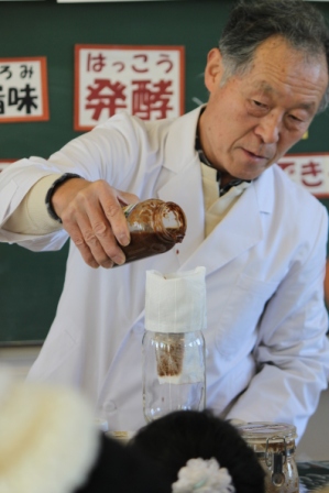 醤油物知り博士出前授業3 公開日 2013/01/28 更新日 2013/01/28 今日の出来事 6ヶ月熟成させた諸味をフィルターで濾すと綺麗な醤油ができました。子供たちは、「諸味」「絞りたての醤油の元」「火を入れて味や香り色を良くした醤油」の3種類を味見しました。諸味では、「生のキュウリにつけて食べたい。」などの声も・・。出前授業の感想は、「全然知らなかった醤油の作り方を知ることができて良かったです。」とのこと。 校長より 6年 授業