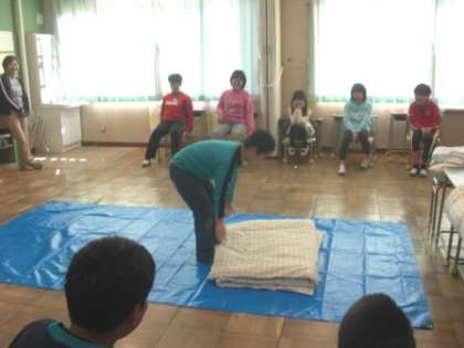 敷く時は、広げたシーツの頭側を布団の下に巻き込む。足側に行き、シーツを手前に引いてしわを伸ばす。その後、頭側と同じように巻き込む。最後に布団の左右を巻き込んで完成。効率の良いやり方を実践してくれました。