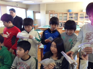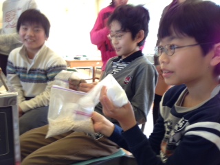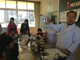 3,4時間目としょうゆ物知り博士が来て、しょうゆのことをたくさん教えてくれました。しょうゆの中にはバラやりんごの匂いが混ざっているようで、みんなで一生懸命に熱したしょうゆをかぎ分けていました。また、もろみのしょうゆ、絞りたてのしょうゆなどをなめて、しょうゆのおいしさを感じることができました。