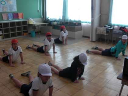 体育「ヨガ」 4 公開日 2013/01/30 更新日 2013/01/30 とちのみ学級 「コブラ」のポーズです。ポイントは、肘を伸ばして上半身を支えることと、つま先を伸ばすことです。子供たちは、絵カードのポーズを、真似ることを楽しんでいます。