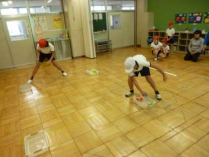 6日の体育は、雪のため教室で行いました。「ボール運び」は、カゴにある10個のボールを、2個ずつ持って次の箱に移動します。ポイントは、反復横とびの要領で足を移動しながら、早くボールを移します。