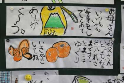 絵手紙2 公開日 2013/02/06 更新日 2013/02/06 今日の出来事 お家の方への感謝の気持ちが短い言葉と絵を通してしっかりと伝わる作品になりました。日頃面と向かって言うのは恥ずかしかも知れませんが、しっかりと身近な人に感謝の気持ちを届けることはとても大切だと思います。 校長より 3年 5年 授業