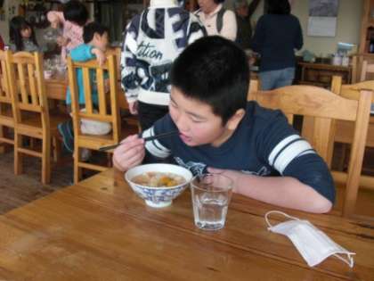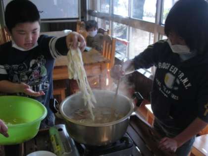 同じ材料、同じ手順で作ったほうとう。しかし、3班それぞれ出来上がった味が違い、みんなお互いの班の「ほうとう」の味見をしました。1番美味しい「ほうとう」は?・・・それは、自分が作った自分の班の「ほうとう」が美味しい!!に決まっていました。3つの鍋は、ほぼ完食。みんな、お腹いっぱい食べて大満足でした。