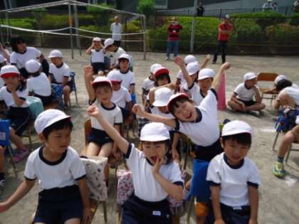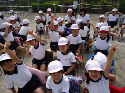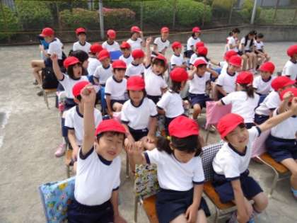 いよいよ運動会です。子供たちはどきどきわくわくです!6年生にいすを運ぶのを手伝ってもらい、みんな児童席につきました。そのときの様子です。みんな元気いっぱいで気持ちも高まっています!今年のスローガンは「走りぬけろ!ゴールの先へ」です。このスローガンを胸にがんばりましょう!フレーフレー愛宕!
