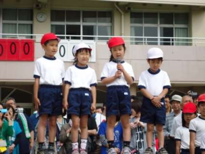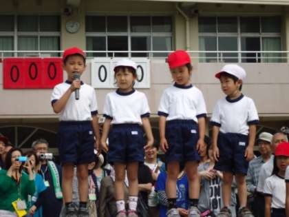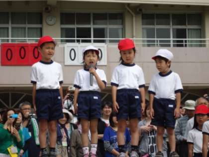 さあ、はじめの言葉です。各クラスから方赤白1名ずつ選出されました。学校でも家でも練習を重ね上手にはじめの言葉を言うことができました。礼の仕方やマイクの渡し方もしっかりとできました。