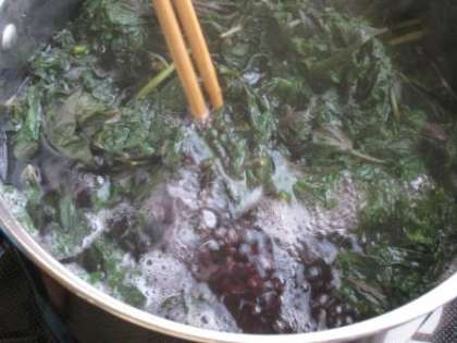 お湯で5分間煮て、しそを取り出して、砂糖と酢を入れたら出来上がりです。