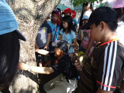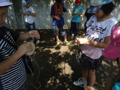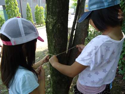 樹木プレート 1 公開日 2013/07/09 更新日 2013/07/09 とちのみ学級 上柚木公園の木に、手作りプレートを付けに行きました。担当は、「こなら、こぶし、くぬぎ、やまぼうし、やまざくら」の5本でした。 始めに、プレートに通した麻紐をどのように木に結び付けるのかを教えていただきました。普段の紐結びと違うため少し戸惑いました。しかし、友達と協力すれば上手くいくことが分かりました。