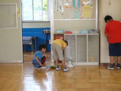 教室の大掃除をしました。いつも使っている場所でも、よーく見ると埃が積もっていたり、砂がたまっていたり…。「あっ。ここにもある!」などと言いながら、教室の隅から隅まで、一生懸命にゴミを集めていました。