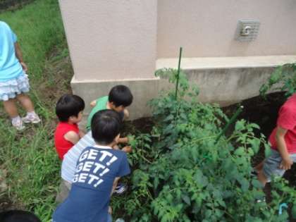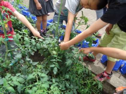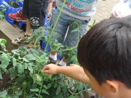 1年生では春からあさがおと並んでトマトを育てています。葉や花の観察も終え、続々と緑色の実をつけてきています。そんな中、朝子どもたちが「先生!トマトが赤くなったよ。」と伝えてくれました。その日からどんどん赤くなり始めた実が収穫できるようになっています。採れたトマトはランダムに子どもたちに配っています。全員に配れると幸いです。お家で食べた際にはぜひ味の感想を教えてくださいね。