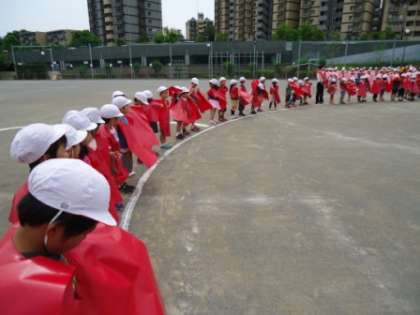 愛宕小学校も今年で20歳になります。7/1に航空写真を撮りました。子どもたちは事前に配布されたエプロンを首から下げ、校庭の指定された位置について待ちました。準備が終わると遠くのほうから飛行機の飛ぶ音が聞こえてきました。飛行機は愛宕小の周りを3周旋回している間に写真を撮りました。子どもたちは緊張している様子でしたが、撮り終わるとほっとした表情が見られました。飛行機は帰りに翼を左右に傾けて手を振ってくれました。