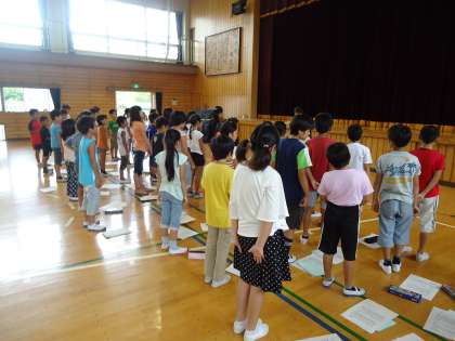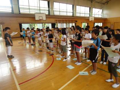 音読発表にむけて練習をしました。 公開日 2013/09/05 更新日 2013/09/05 4年生 音読発表にむけて、「寿限無」の練習を4年生学年合同で行いました。 暑い体育館でしたが、子どもたちは自分の担当を決め、精一杯声を出していました。 本番は9月10日です。本番にむけ、練習をしていきます。 4年