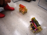 ロボットが作り終わると、ロボットが歩く早さや歩く力を競って遊んだり、ロボットに色を塗って飾りつけたりしました。団扇やストローを使い、子どもたちは必死になって風を送ってロボットを歩かせていました。