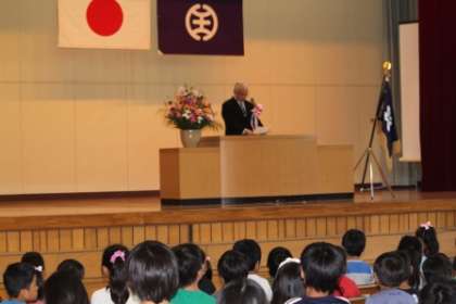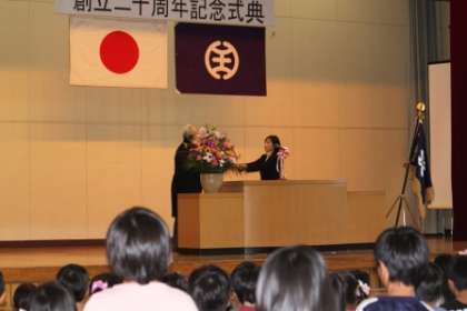 30名のご来賓とたくさんの保護者の方々にご出席いただきました。児童全員参加のため全校演奏から式典終了まで45分間です。校長の式辞では、「保護者や地域の方々が、大変な思いをして今の愛宕小学校を築いてきてくださったことに心から感謝する気持ちをもつと同時に、今度は自分たちがその伝統を受け継いでいくんだという気持ちをもってほしいこと。本校の歴史を振り返る中で、自分たちの生活をもう一度見つめ直し、流行に流されることなく、人のことを思いやり、力いっぱい生きていくことの大切さを学んでほしいこと。」についてのはなしがありました。坂倉仁教育長からのあいさつの後に、愛宕会より記念品として「桜の木」が贈呈されました。11月に植樹式を行う予定です。