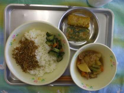 10月3日(木) 今日の給食 公開日 2013/10/03 更新日 2013/10/03 給食室から ごはん ふりかけ(じゃこ・アーモンド) ちくわの2色揚げ(青のり・カレー) 肉じゃが ゆかりきゅうり 牛乳 給食