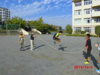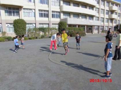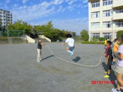 大縄集会 公開日 2013/10/03 更新日 2013/10/03 とちのみ学級 とちのみは、2グループに分かれました。波跳びグループは114回、8の字跳びグループは91回跳びました。波グループは6人で、8の字跳びは5人で4分間です。少人数で、こんなに多くの回数が跳べたことは、とてもすごいことです。今日は、10月になっても蒸し暑い朝でした。その中で本当によくがんばりました☆☆☆