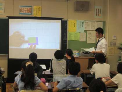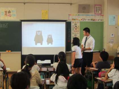 1組と2組の各クラスでプロジェクターを使って、くまもんやドラえもんを拡大し、楽しい授業が行われました。