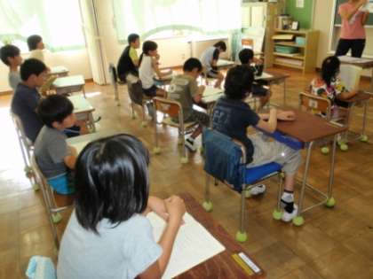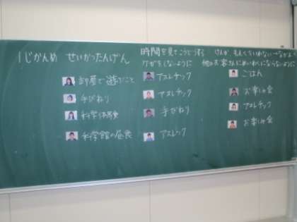 明日は、いよいよ宿泊学習に出かけます。今日は、日程の確認をしました。単元帳(しおり)を見て話を聞くだけでなく、先生が用意していた絵を見ながら、2日間の予定を確かめました。絵があるだけで実際の行動をイメージできるようで、子供たちは真剣に話を聞いていました。