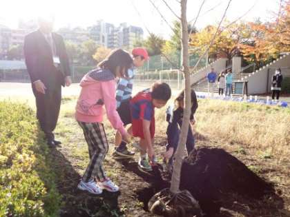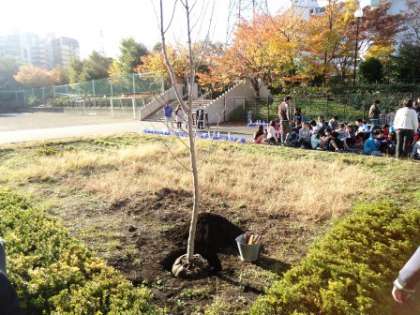 植樹式がありました。 公開日 2013/11/19 更新日 2013/11/19 4年生 愛宕小学校20周年を記念して、あたご会から寄贈されたソメイヨシノの植樹式が行なわれました。 式では、各学年から代表の児童がソメイヨシノに土をかけました。 4年生からも各学級から一人ずつの児童が代表として、土をかけました。 子どもたちは、新しい木に興味津々で、4月にどんな花をつけるのか楽しみにしていました。 4年