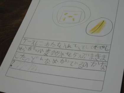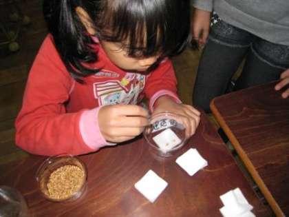 生活・理科 公開日 2013/11/25 更新日 2013/11/25 とちのみ学級 「小麦」を育てることにしました。今日は畑に植える前に「発芽の様子」を見るための用意をしました。透明容器に湿らせた綿を置いて、その上に3〜5粒、小麦をのせました。その後、観察記録を書きました。 「色は茶色です。」「まん中に線がある。」などと書いてありました。 いつ芽が出るかな? 子供たちの予想は、明日〜2週間後と様々です。 さて正解は誰かな?
