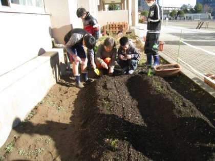 体育館での終業式の後、教室で発芽の観察していた「小麦」を畑に植えかえたり、大掃除をしました。