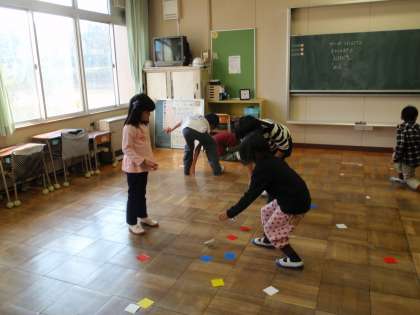 まず、そのめんこで、4等分した折り紙をひっくり返すことに挑戦してみました。なかなか難しく、何度も何度も打つ姿が見られました。しばらくすると、「できたー!」という声が聞こえてきて、できる子が増えてきました。返せない子は、8等分、16等分した折り紙をねらいます。折り紙を返すことができるようになったら、めんこ同士で対決!!