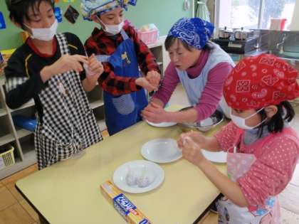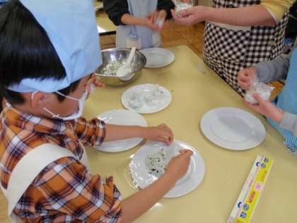 次に、おにぎり作りをしました。ご飯にふりかけを混ぜ、ラップにくるんで丸めました。何個も作ったので、テキパキと作業ができるようになりました。
