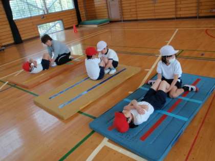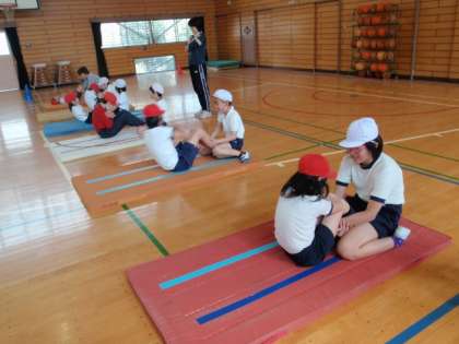 体育館での体育は、今日が初めてでした。体力運動能力調査に向けて練習をしました。今日、練習したのは、「上体起こし・反復横跳び」です。高学年は、やったことを思い出しながら、正しく動くことができていました。低学年の子供たちも真剣に、動きを真似る様子が見られ、とても感心しました。去年の記録よりも上を目指して、練習に励んでいます!!