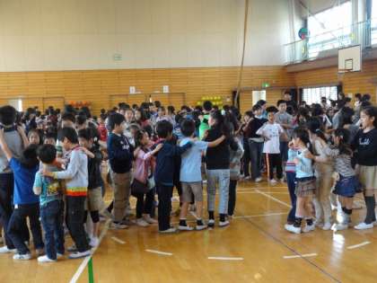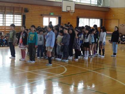 4月17日に行われた1年生をむかえる会において、4年生は「じゃんけん列車」を企画しました。最初は1年生と4年生で行い、次に全校児童で行いました。1年生と触れ合うよい機会となりました。