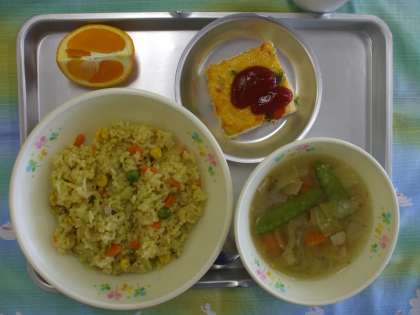 4月22日(火) 今日の献立 公開日 2014/04/22 更新日 2014/04/22 給食室から メキシカンライス カラフルオムレツ 野菜スープ くだもの 牛乳 ☆☆☆ 産地 ☆☆☆ 玉ねぎ 佐賀 人参 静岡 卵 青森 ピーマン 茨城 赤ピーマン 高知 キャベツ 熊本 絹さや 伊豆 清見オレンジ 和歌山 給食