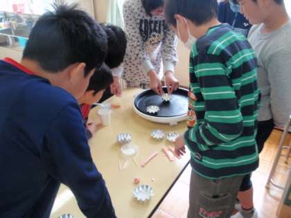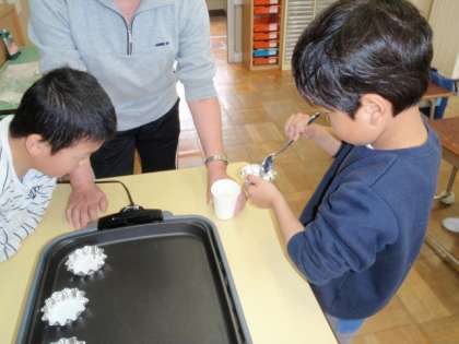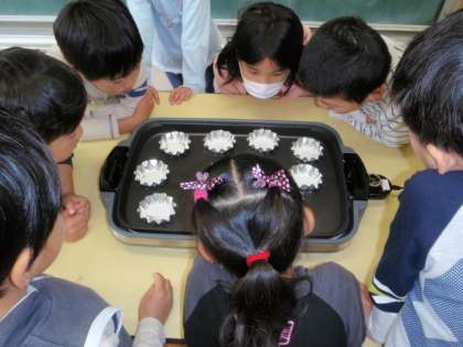 土曜日は、体力・運動能力調査がありました。時間が余ったので「べっこうあめ作り」をしました。アルミのカップにグラニュー糖と水を入れ、ホットプレートの上に置くと…。「泡が出てきたー!」「だんだん白くなったよ。」「色が変わったー!!」など、いろいろな声が聞こえてきました。
