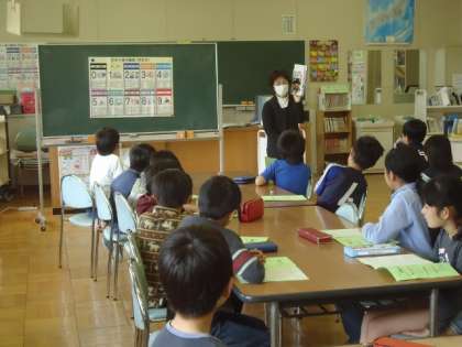 毎週水曜日は、図書館サポーターの方が勤務される日です。今日から図書室活用オリエンテーションが始まりました。3週にわたり、クラスごとに図書室の使用の仕方や本の借り方についての説明があります。今日は、第1回のオリエンテーションです。借りられる本の冊数は、1冊から2冊に増え、喜んでいる表情がたくさん見られました。
