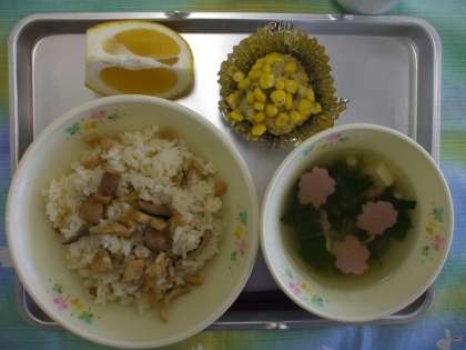 4月23日(水) 今日の給食 公開日 2014/04/23 更新日 2014/04/23 給食室から たけのこごはん 菜の花蒸し すまし汁 くだもの 牛乳 ☆☆☆ 産地 ☆☆☆ 生姜 熊本 小松菜 八王子 えのき 長野 たけのこ 鹿児島 美生柑 愛媛 給食